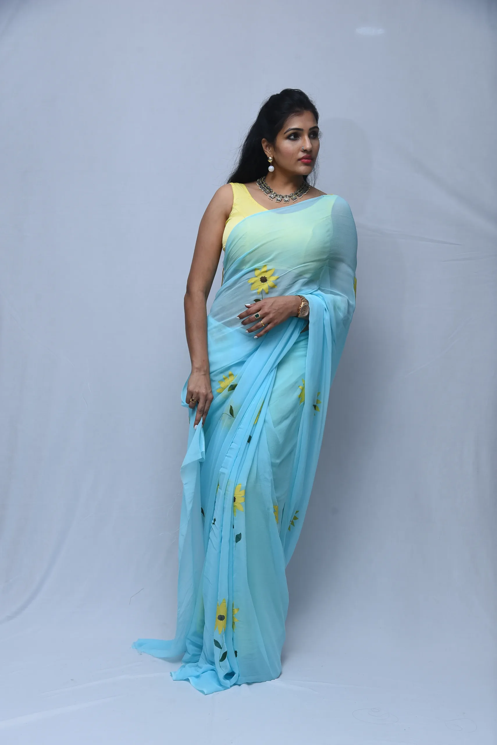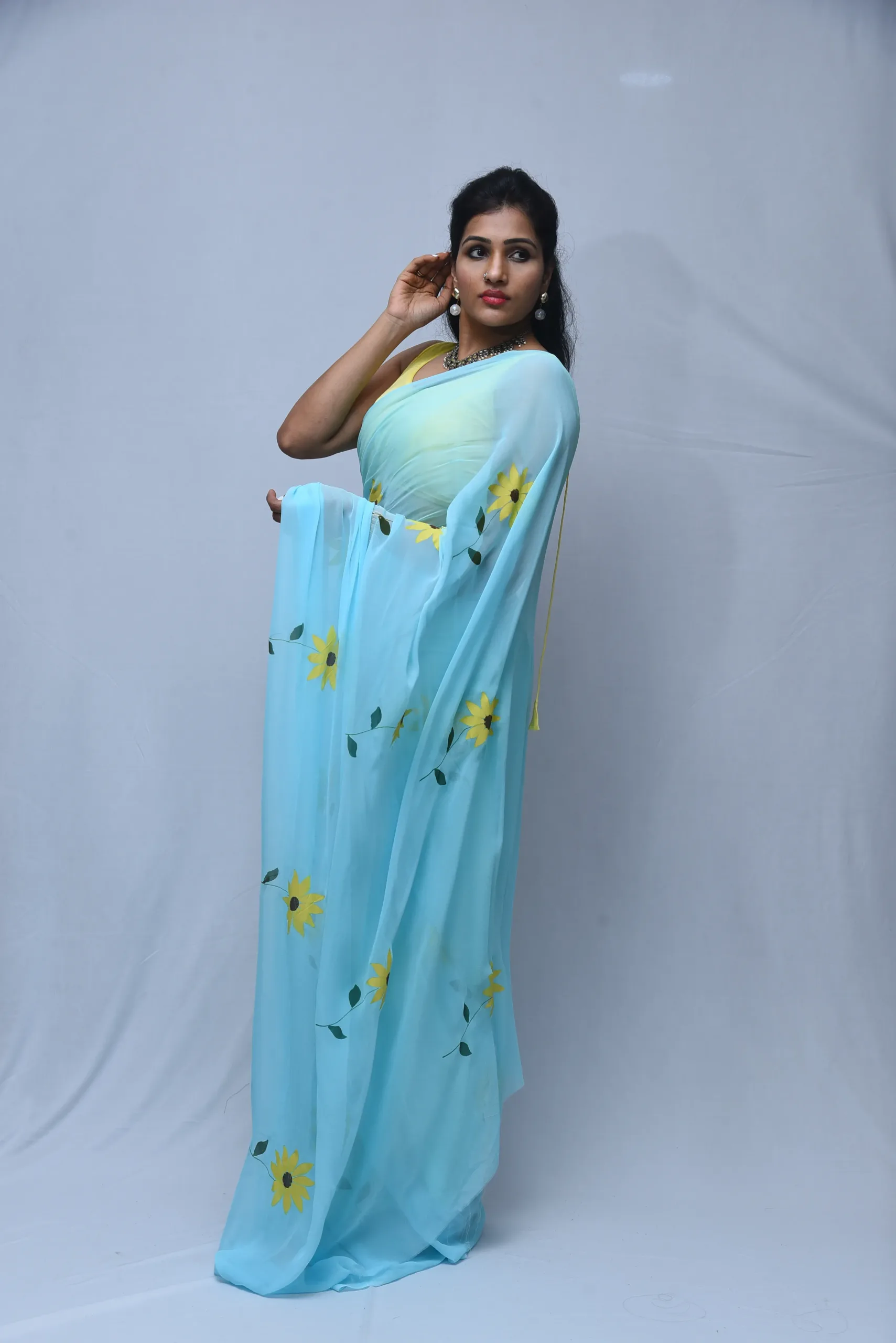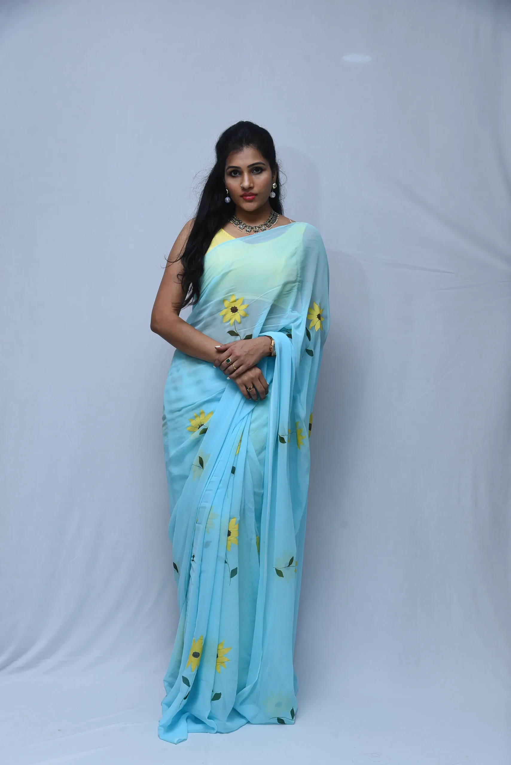 Elegant pure georgette hand painted ice blue saree with sunflowers and running unstitched blouse material. For other customisations and blouse stitching, please ping us on WhatsApp below.