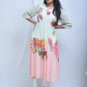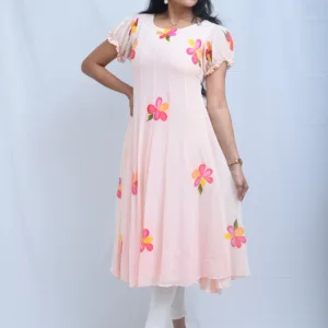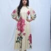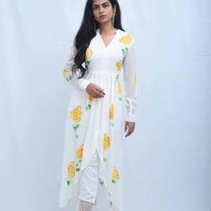 Elegant pure georgette hand painted white dress with yellow roses, sizes XS to XXL. For other customisations, please ping us on WhatsApp below.